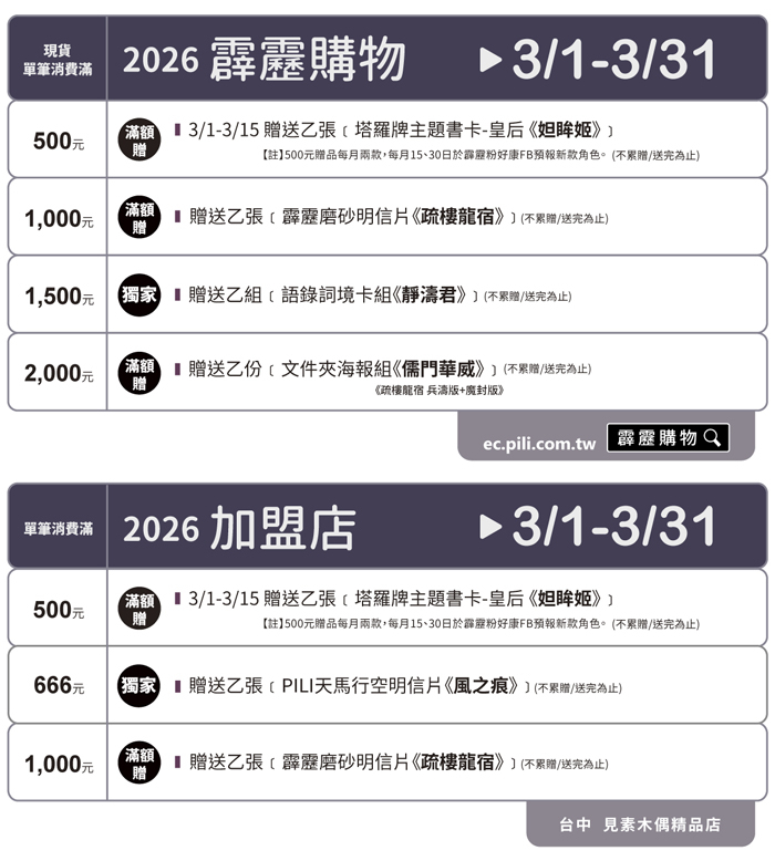 - 霹靂購物(宅配):03/06(五)起陸續出貨。